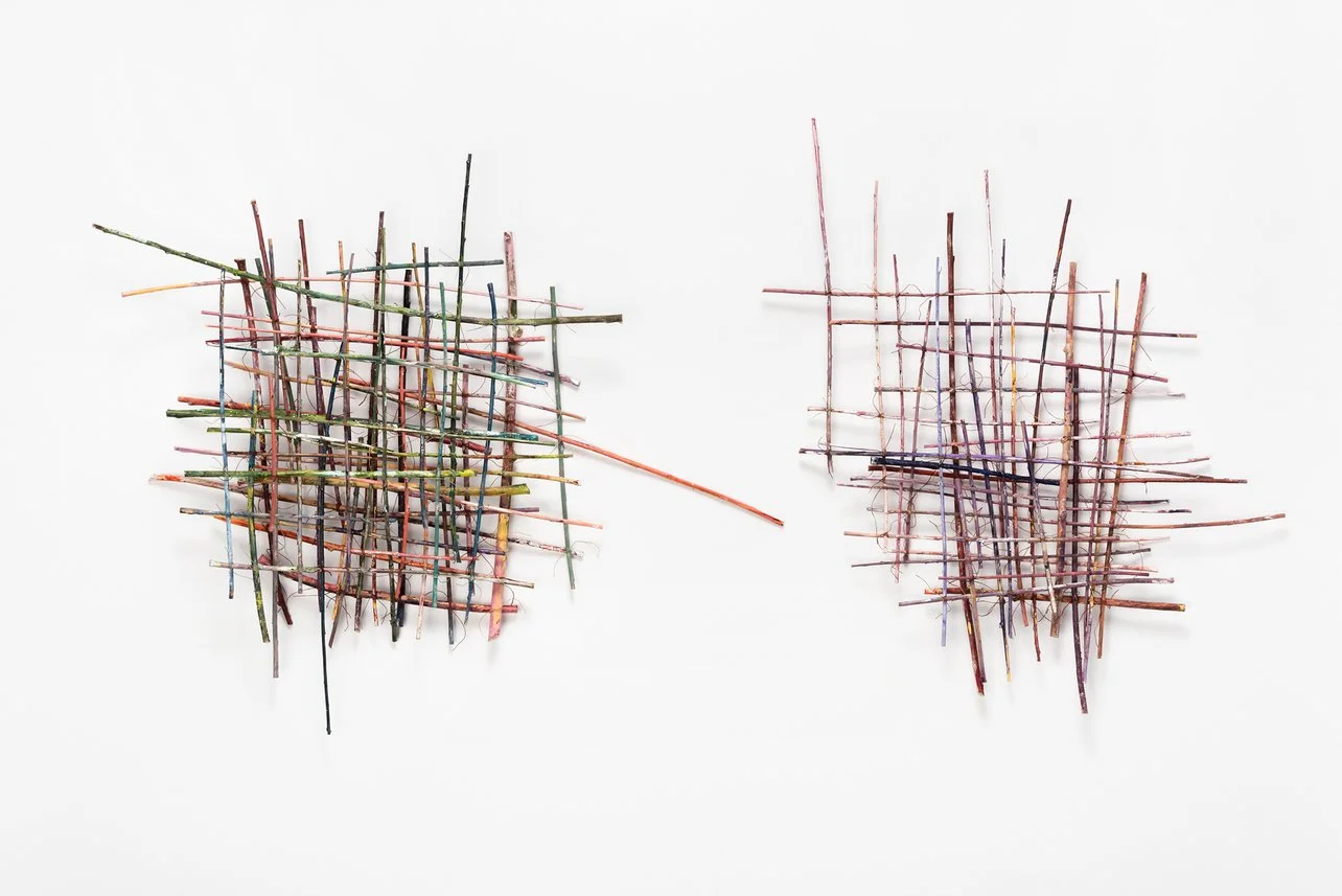 round reed, pastel pigments, waxed linen; charcoal drawing